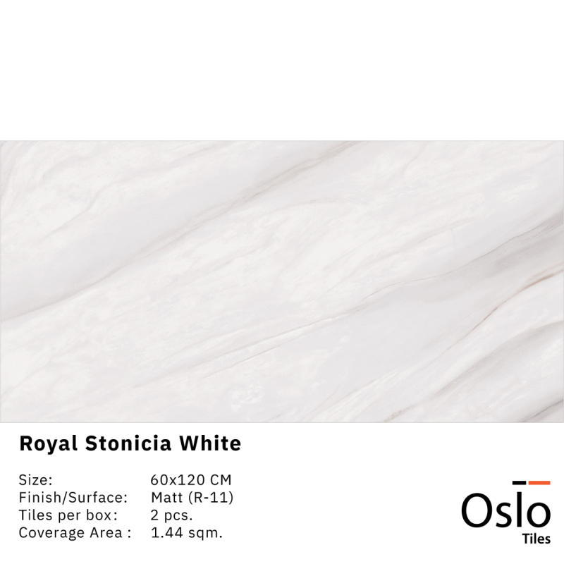 กระเบื้องพอร์ซเลน OSLO TILES : Royal Stonicia White - ลายหินสีขาว 60x120 CM ผิวด้าน (R-11) ความหนา 0.9CM บรรจุ 2 ชิ้น/กล่อง พื้นที่ 1.44 ตรม.